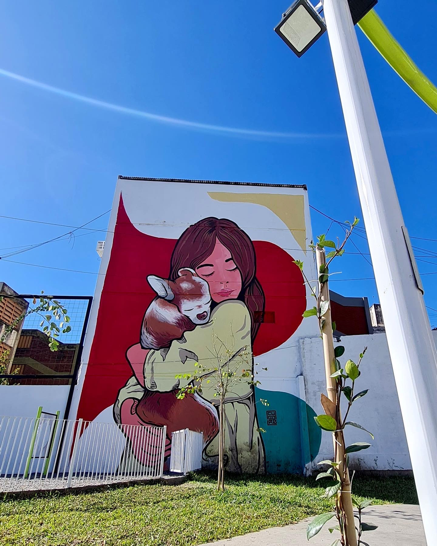 TITULO "PLACERES SIMPLES" serie tríptico de murales en gran formato - año 2023 Con imágenes simples y figuras icónicas se busca evocar esas sensaciones de niñez y juventud tan primales y puras, que terminan siendo muy pregnantes en nuestra memoria a lo largo de la vida busca evocar esos micro momentos hermosos y simples como Abrazar una mascota, la sensación de cuando llegas a la cima de la hamaca, mirar el cielo y respirar hondo, sentirse pleno y libre son acciones simples cargadas de gran connotación simbólica y de una fácil lectura e identificación con el espectador que suelen tener como cobijo el espacio publico, las plazas y parques.