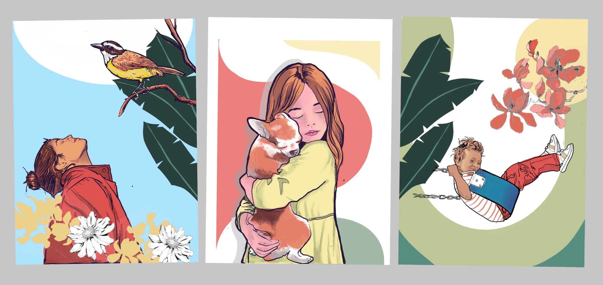 TITLE "SIMPLE PLEASURES" triptych series of large-format murals - year 2023 With simple images and iconic figures, the aim is to evoke those primal and pure sensations of childhood and youth, which end up being very pregnant in our memory throughout life. evoking those beautiful and simple micro moments like hugging a pet, the feeling when you reach the top of the hammock, looking at the sky and taking a deep breath, feeling full and free are simple actions loaded with great symbolic connotation and easy to read and identify with the viewer who usually have as shelter the public space, the squares and parks.
